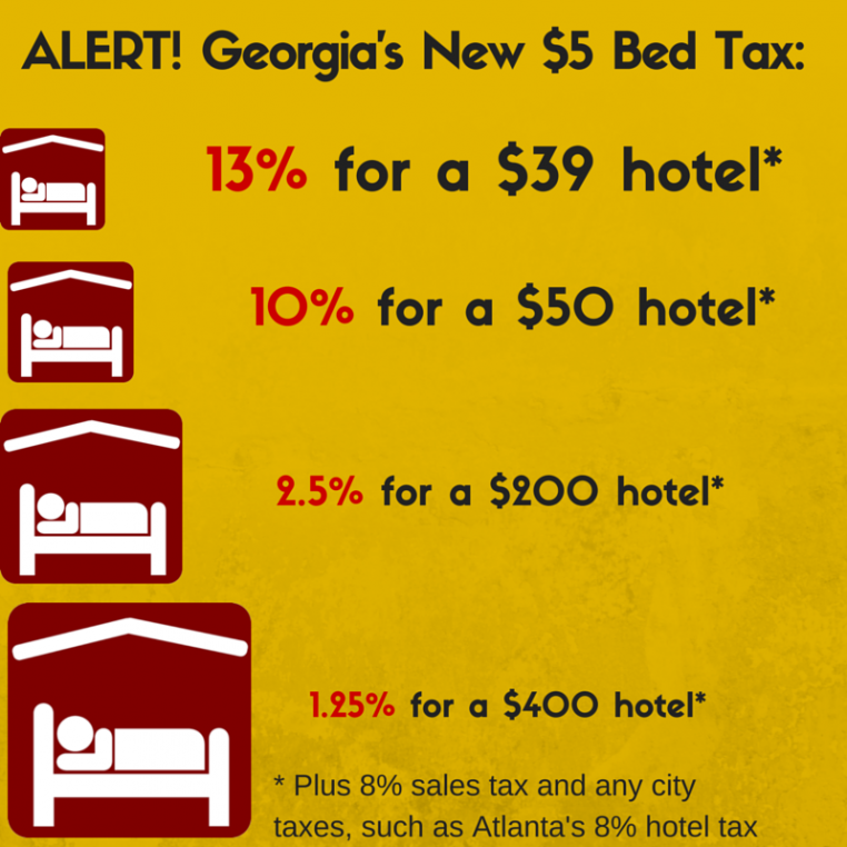 For, as of July, 2015, the GOP-lead Georgia congress has imposed a $5 day A DAY bed tax - no matter what you are paying for your hotel. This was part of a transportation bill to address the infrastructure needs for Georgia's ailing bridges and roads.