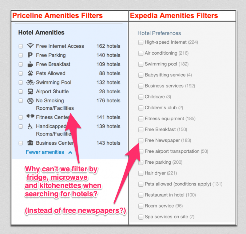 In fact, a room without, minimally, a fridge and microwave can make my stay almost unbearable. However, major hotel searching sites like Priceline and Expedia don't even let you filter by a fridge or microwave - let alone a kitchenette. Certainly, these amenities have much more appeal than, say, a free newspaper!